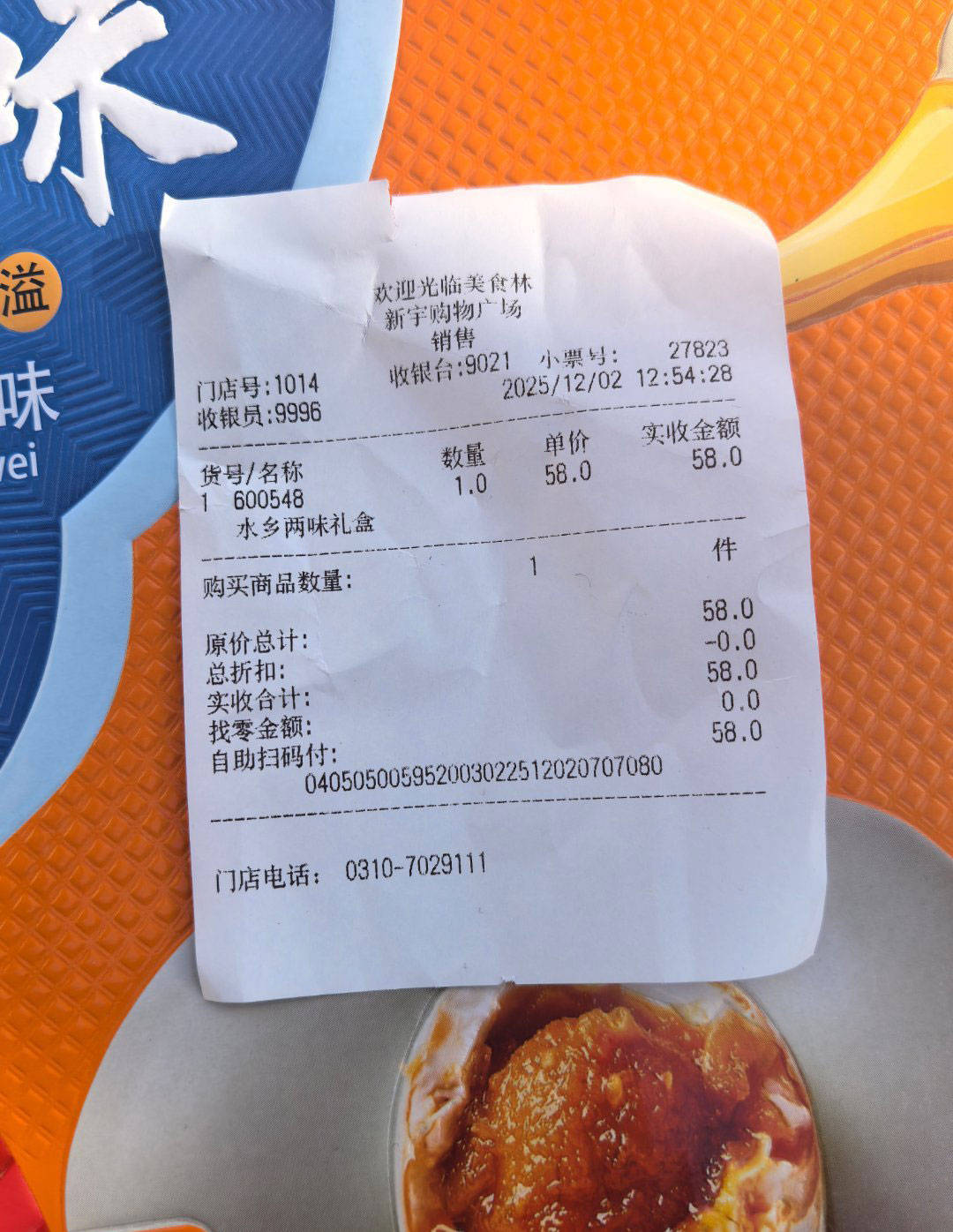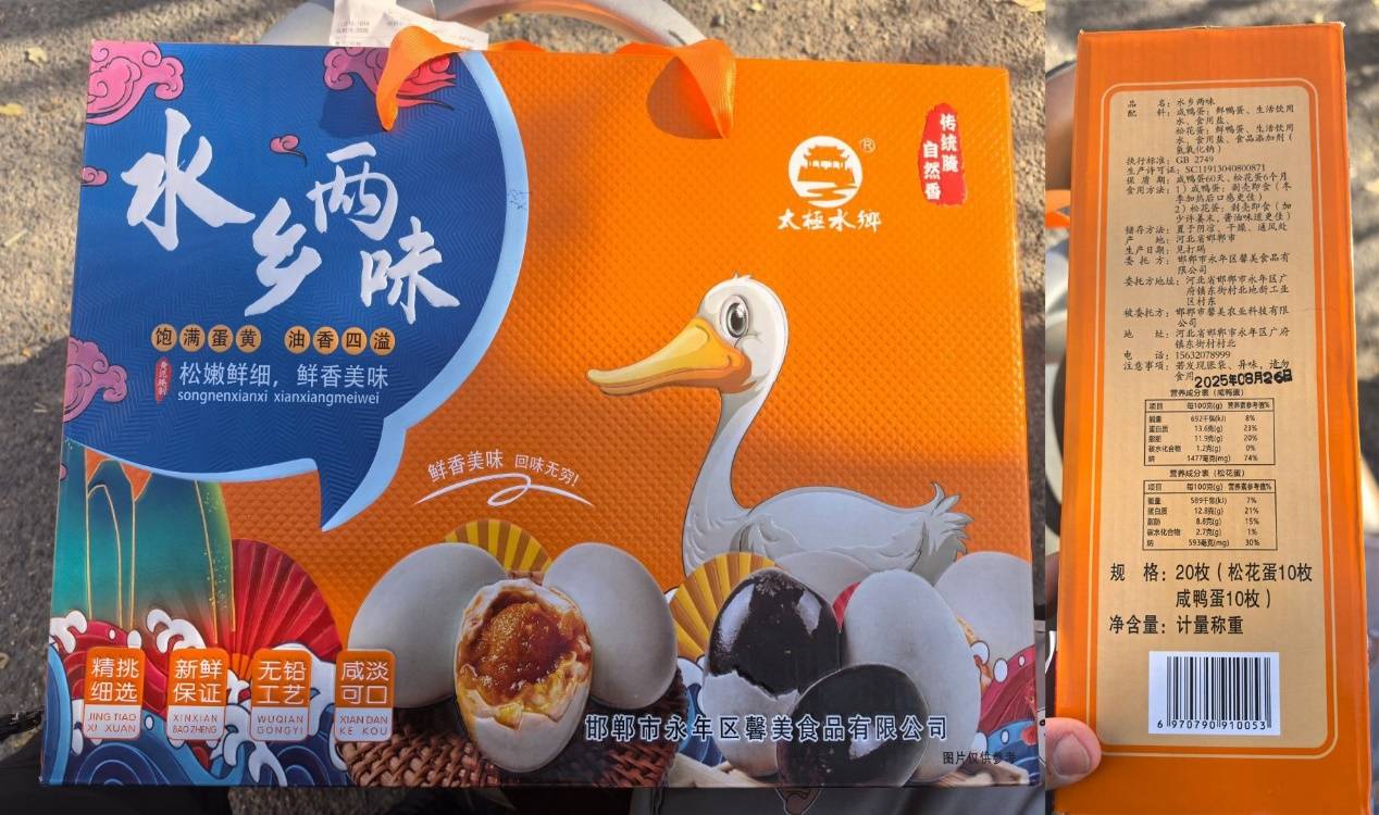 2025年12月2日,消费者正在美食林新宇购物广场购入“水乡两味礼盒”,盒内咸鸭蛋标注出产日期为2025年8月26日、保质期60天,截至采办当日已超期月余。该礼盒同时包含松花蛋,由市永年区馨美食物无限公司出产,却正在终端发卖环节呈现了疏漏。