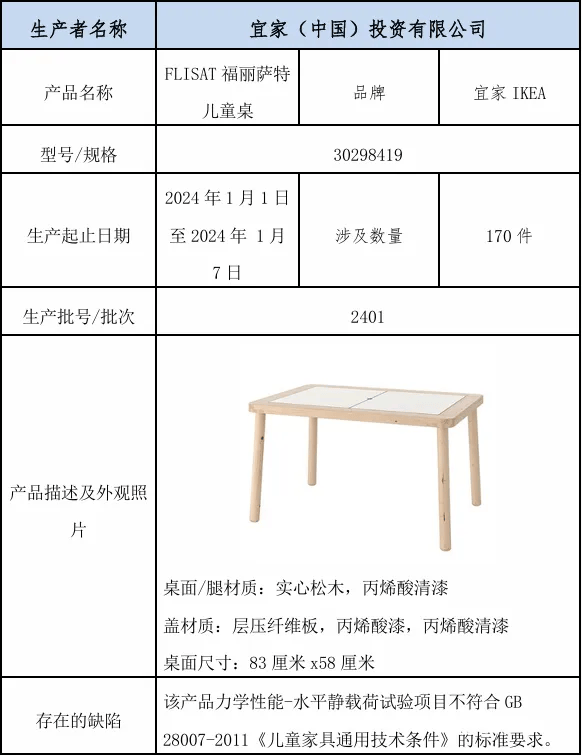 宜家(中国)投资无限公司出产的170件宜家IKEA牌FLISAT福丽萨特儿童桌存正在缺陷,召回刻日为2025年11月13日至2026年2月12日。