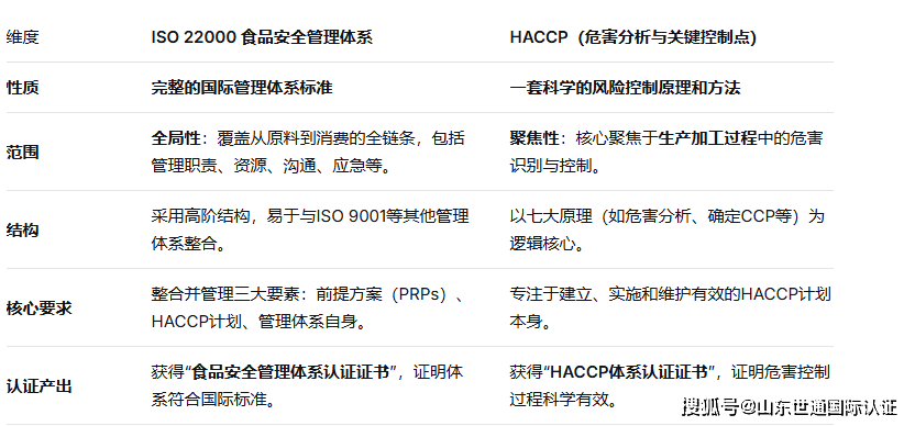 最底子的区别正在于,ISO 22000是一个完整的“食物平安办理系统”国际尺度,而HACCP是一套专注于风险节制的“科学道理和方式”。能够说,HACCP是ISO 22000这颗皇冠上最璀璨的宝石,但皇冠本身还镶嵌着其他不成或缺的构成部门。ISO 22000尺度为企业供给了一个从农场到餐桌的全局性办理框架。它采用取ISO 9001质量办理系统不异的高阶布局,强调系统的筹谋、运转、评价和改良。其焦点正在于 “整合” ,要求企业将HACCP道理取前提方案(PRPs,构成一个同一、协调的办理系统。它关心的不只仅是出产过程中的风险节制,还涵盖了沟通、应急预备、逃溯系统以及持续改良等更普遍的办理职责。HACCP(风险阐发取环节节制点)则是一套高度聚焦、逻辑严密的防止性东西。它如统一把精准的“手术刀”,曲指食物出产过程中可能发生的生物、化学和物理风险。通过系统性地进行风险阐发,确定环节节制点(CCP),并为其成立环节限值、法式和纠偏办法,HACCP确保能将显著风险消弭或降低至可接管程度。其关心范畴次要集中正在出产加工环节的具体工艺步调。