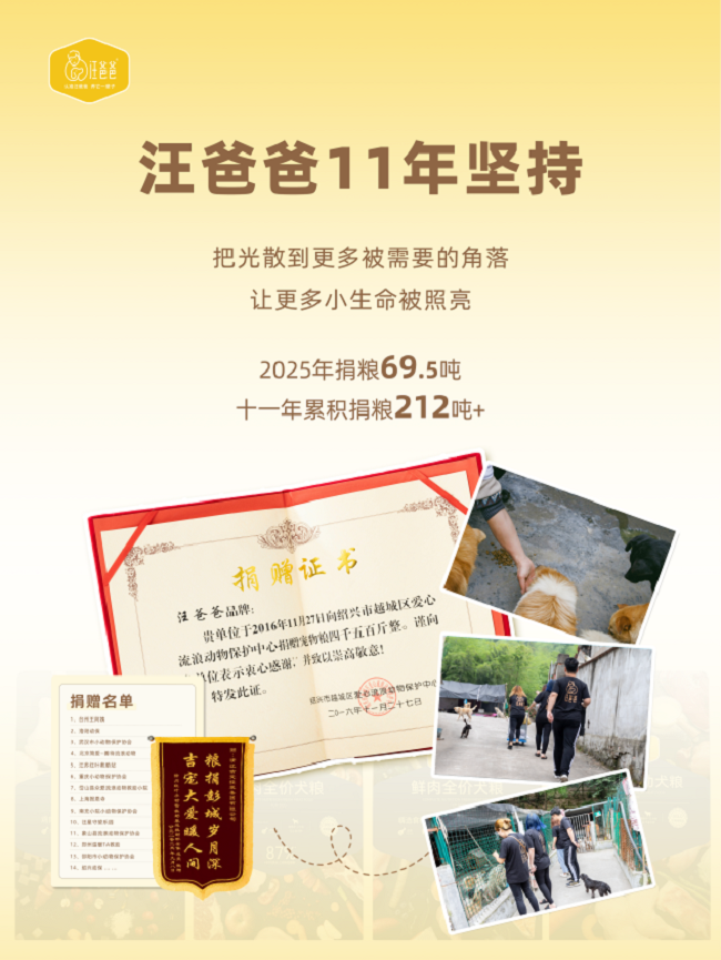 自2014年成立以来,汪爸爸便以认准汪爸爸,养它一辈子的品牌深耕市场,将社会义务融入成长血脉。期望流离动物也能吃上健康的粮,让流离动物再次找到幸福家园,2016年起头联袂动物组织倡议公益勾当,每年捐粮,11年累计捐赠212+吨狗粮,呼吁社会关心义务养宠。